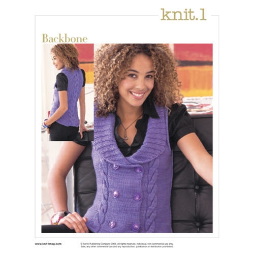 This close-fitting double-breasted shell features two sets of buttonholes in front and a dramatic but uncomplicated back cable sandwiched by diagonal ribbing.