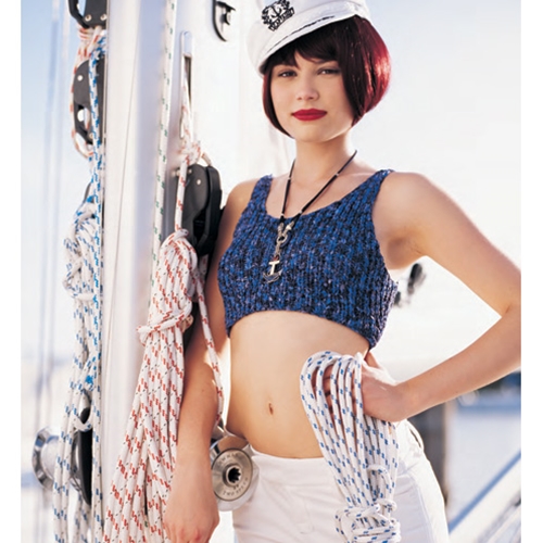 The back and front are knit identically in Lion Brand Yarn’s Incredible ribbon yarn. Just sew the side seams and shoulder straps and it self-finishes on an even keel.