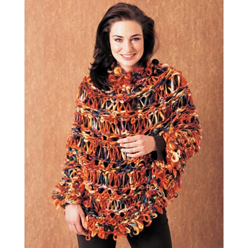 Recurring rows of triple yarn over drop stitches and openwork combine to form an airy body that’s accented by a fanciful loop-stitch pattern at the neck and lower edge.