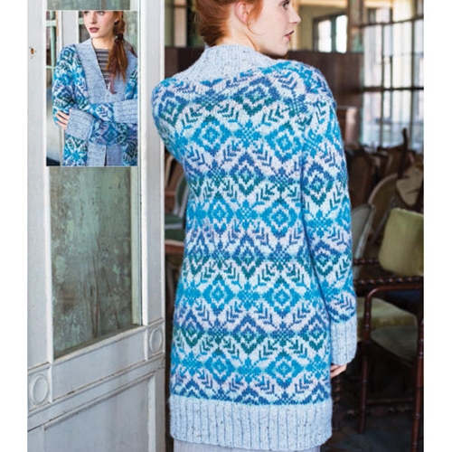 Oversized long Fair Isle cardigan with extra-long set-in sleeves, wide ribbed bands and collar shaped with short rows.