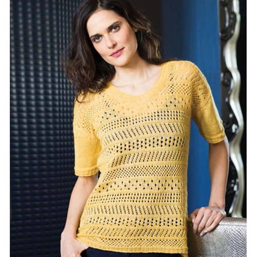 • 33 sts and 44 rows = 4″/10cm over multiple eyelet lace pats using size 3 (3.25mm) needles, both after washing and blocking.