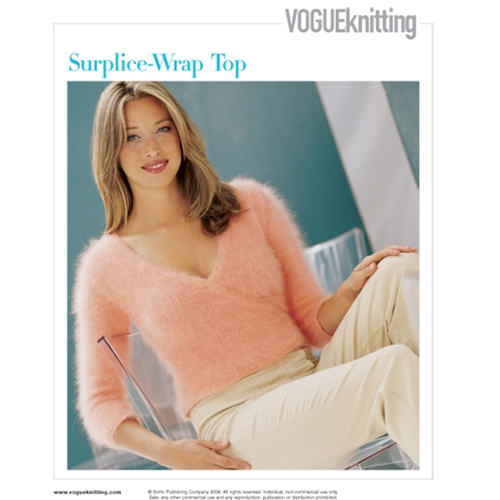 This stockinette-stitch surplice-wrap is finished off with feminine crochet all around the edges.